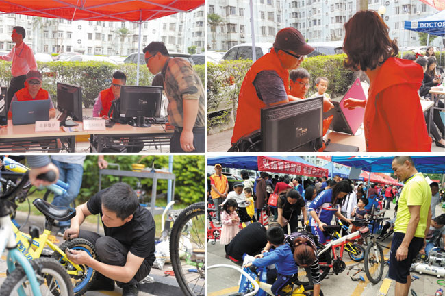 深物業集團信息中心、深圳國貿物業智能運營部的志愿者們用專業技能為居民修電腦、修手機。一位阿婆拿著兩部老人手機過來心急地說:“好久沒用這兩部手機,開不了機,是不是壞了?”志愿者接過手機立即認真檢查,并告訴阿婆:“奶奶,你的手機應該長按這個鍵開機。兩部手機都能開機,只是一部沒有插通訊卡,另一部手機可能欠費了。”志愿者一遍又一遍耐心地教會阿婆如何操作。