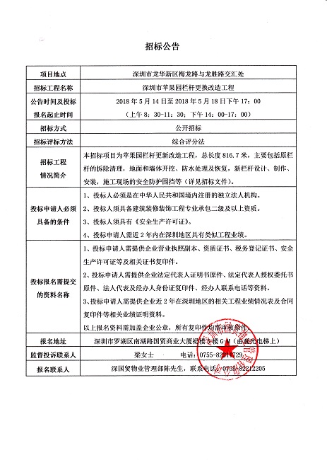 深圳市蘋果園欄桿更新改造工程招標公告