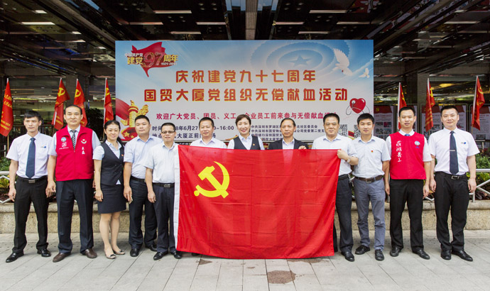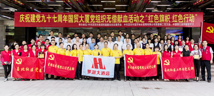 6月27日,在深圳市國貿大廈前廣場舉辦了第七屆“紅色旗幟,紅色行動”國貿大廈黨組織無償獻血活動。活動是由中共深圳市羅湖區南湖街道辦嘉北社區工作站黨委、中共深圳市物業發展集團有限公司、中共深圳市國貿物業管理有限公司黨委第二黨支部、國貿大廈管理處等單位和社會團體,大力支持和協助下,開展的以“書記抓項目,支部創品牌,黨員爭先鋒”為宗旨,旨在發揮黨員模范作用,構建社會主義核心價值觀為主題的黨建公益活動。