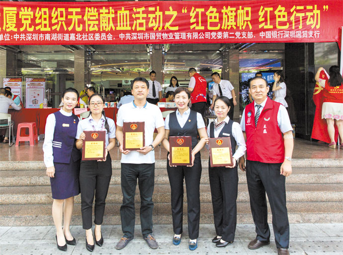 國貿大廈“紅色旗幟 紅色行動”第一屆無償獻血活動始于2011年,至今已舉辦了六屆,活動累計組織黨員群眾無償獻血436人,累計獻血量達152000毫升,被深圳市血液中心、紅十字會屢次嘉獎。