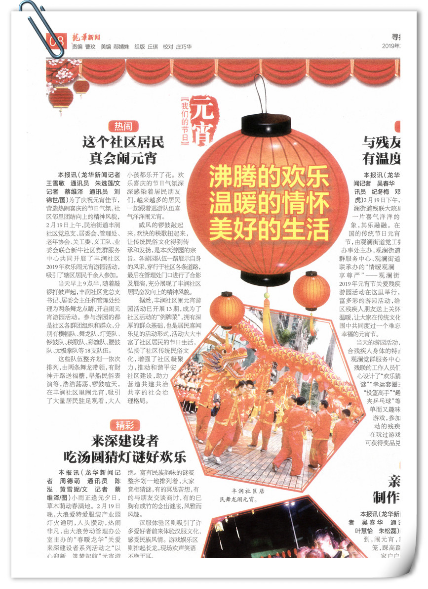 2019年2月21日《寶安日報》龍華新聞第C08版:融和《這個社區居民真會鬧元宵》進行了新聞報道。