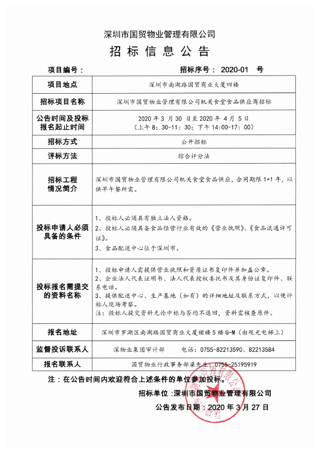 深圳市國貿物業管理有限公司機關食堂食品供應商招標信息公告