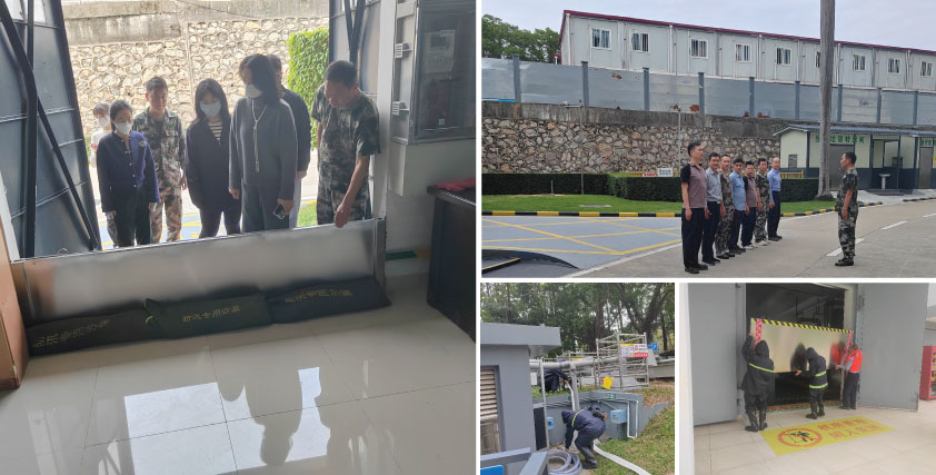 此次演練以深圳遭遇連日暴雨、生物孵化器項目水位上漲、污水站地下操作間因暴雨發生雨水倒灌為背景。項目人員接到險情報告后,即刻啟動防汛應急預案,各應急小組立刻集合到位,現場應急小組、設備組換好防護服裝后有序開展各項應急工作,應急小組負責安裝污水站及各設備房的擋水板,并將沙袋運送至現場;設備組兵分兩隊,一隊到現場安裝抽水泵準備抽水,另一隊檢查各設備房設備運行情況。各小組服從指揮調度,各司其職、配合默契。