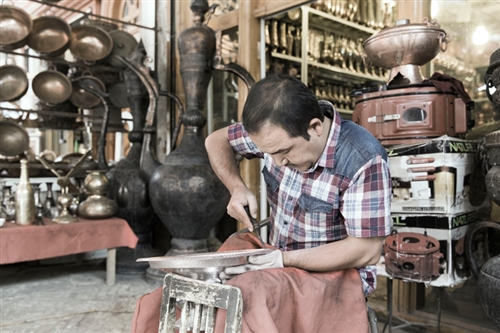 順著職人街一家挨一家的店鋪?zhàn)哌^,丁丁當(dāng)當(dāng)、喀嚓喀嚓,敲打聲和銼磨聲不絕于耳,每個(gè)店鋪前都好似一個(gè)手工制品展覽。